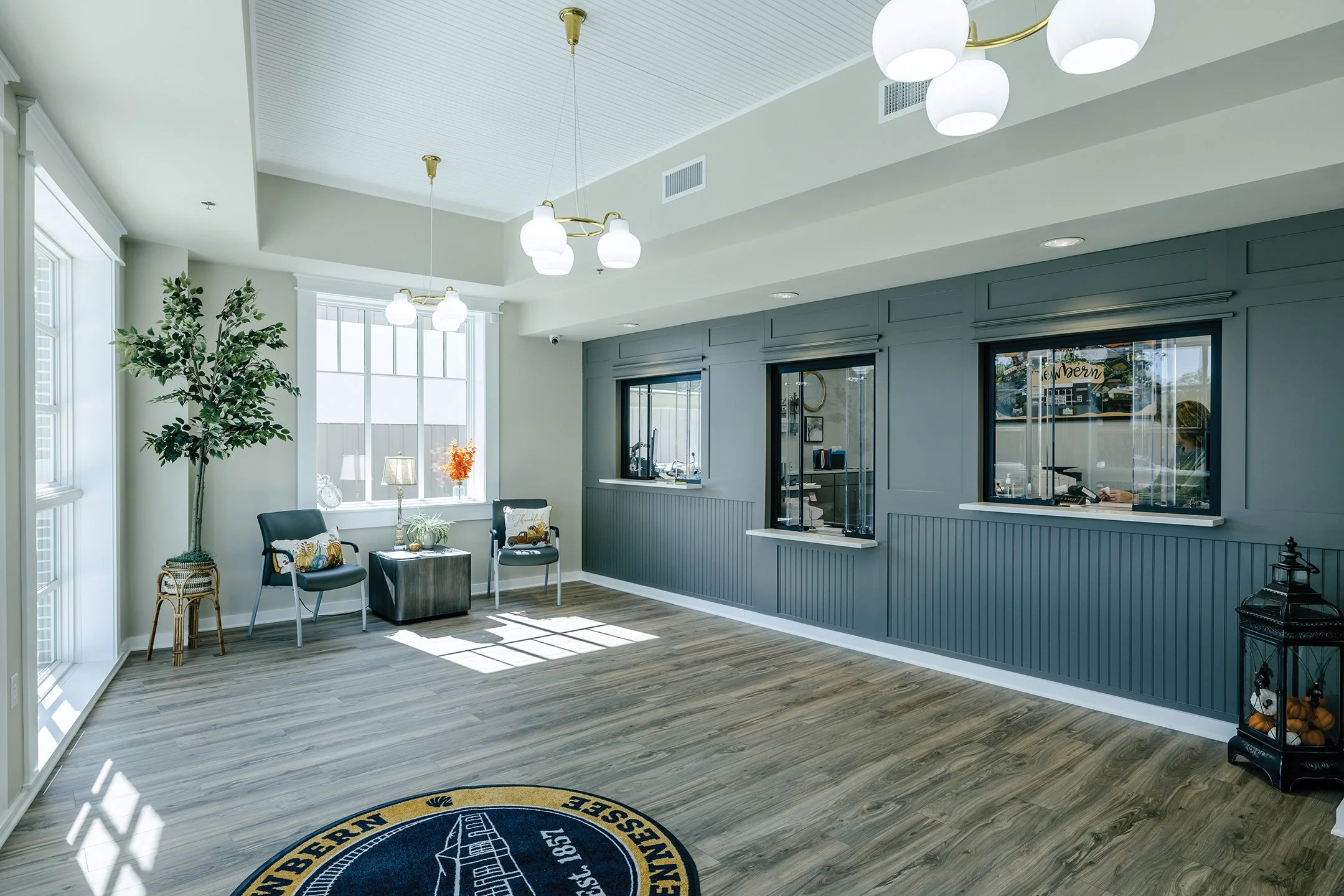 Plenty of natural light streams in from the beautiful windows in the front lobby, while below, patrons can conduct business with clerical and office staff who are securely situated behind walls with protective glass.